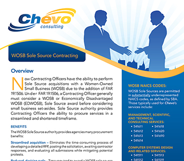 Now Contracting Officers have the ability to perform Sole Source acquisitions with a Women-Owned Small Business (WOSB) due to the addition of FAR 19.1506. Under FAR 19.1506, a Contracting Officer generally must consider a WOSB or Economically Disadvantaged WOSB (EDWOSB), Sole Source award before considering small business set-asides. Sole Source authority provides Contracting Officers the ability to produce services in a streamlined and shortened time frame.