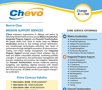 Chevo provides services to help our clients Change and evolve their organization, portfolio, and programs. These services include Mission Acceleration, Integrated Program Support, and Financial Transformation.